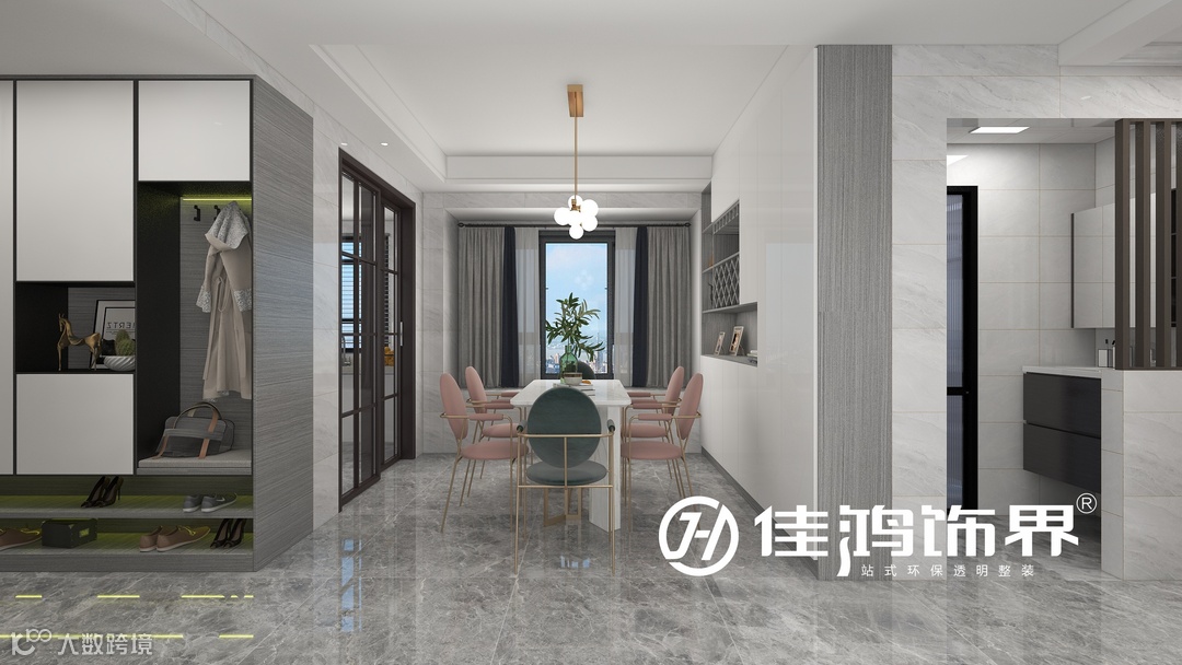 餐厅延续了客厅的回字形吊顶和大理石纹地面,保证整体格调的一致性。