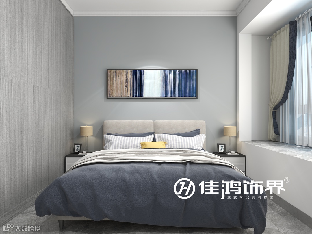主卧区别于公共空间的要素,明晰的空间划分出不同的功能区域,整体呈现出一个简练纯净的就寝环境,低饱和度的冷色配色以及飘窗增加了卧室的温馨氛围。