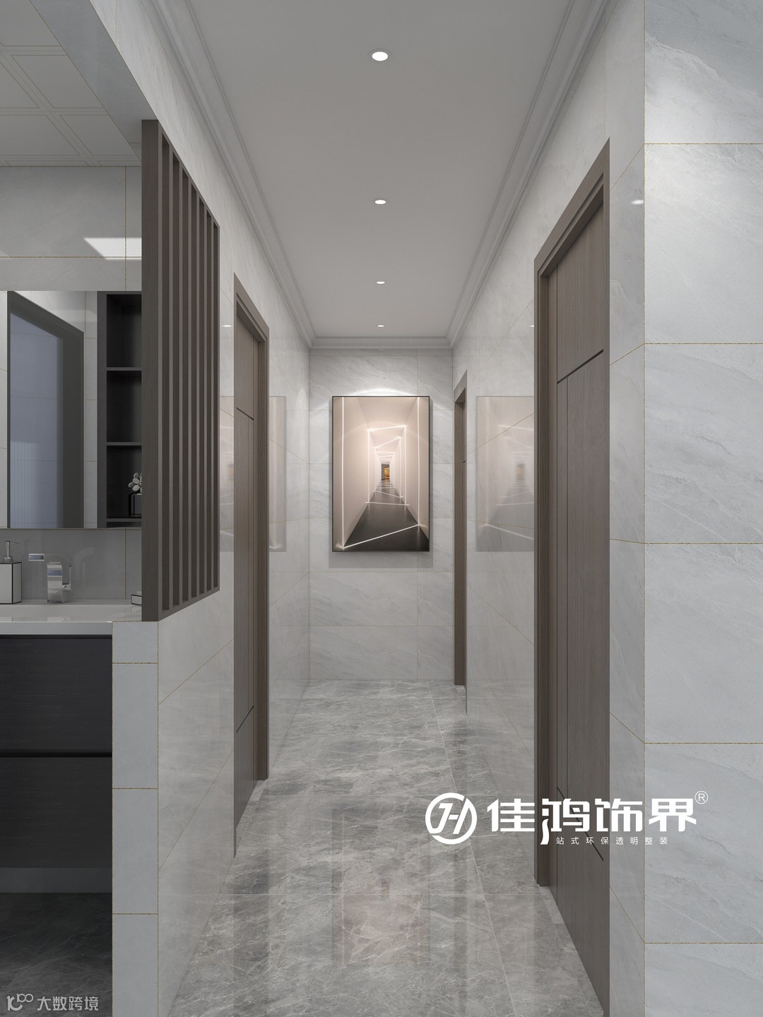 过道形成两边区域自然的划分。吊顶安装了一排筒灯,映照在二维空间挂画上,让过道空间更显深邃宽敞,感受精致简约的慢生活。