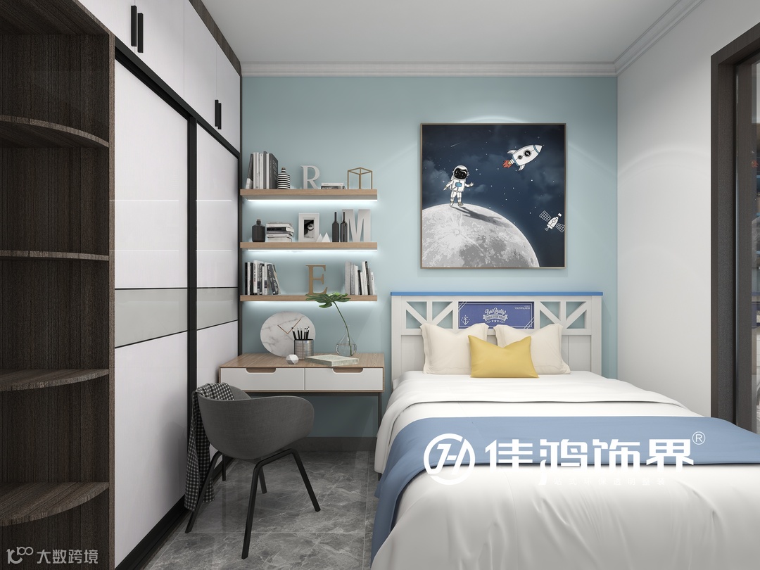 儿童房购置了一款镂空造型的小床,天蓝色的床头背景悬挂宇宙饰画,能为孩子带来一个促进睡眠、神秘具有想象力的小空间。