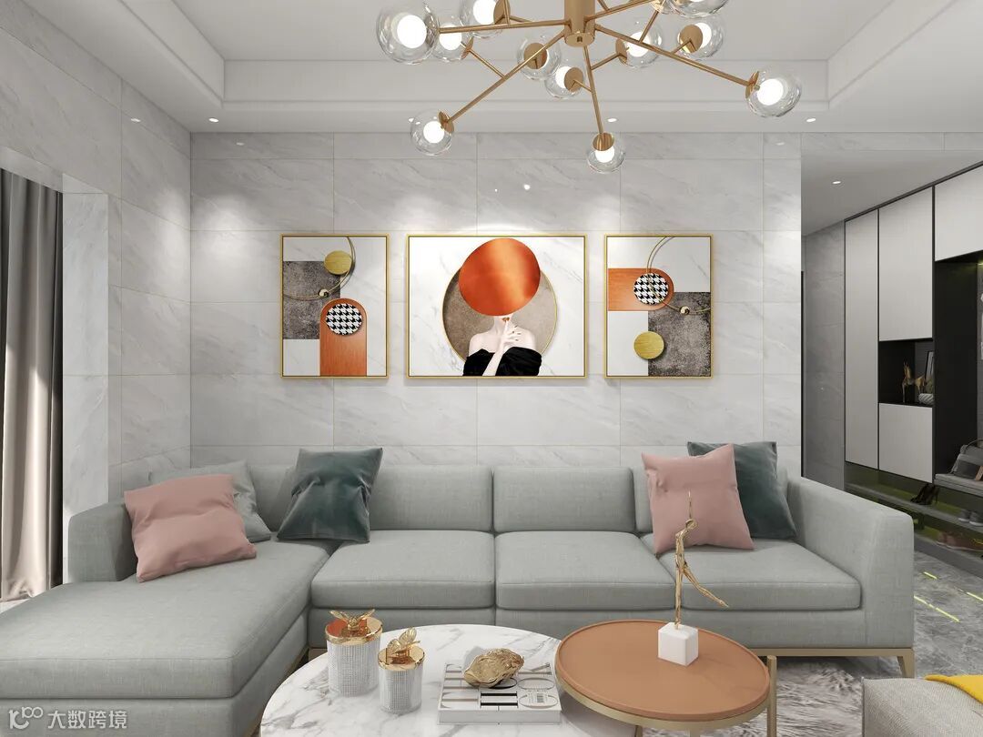屋主对轻奢质感的物件十分青睐,于是选用大理石类家具搭配黄铜元素,加入布艺的鸽子灰沙发、艺术装饰画,优雅又精致的腔调便从空间弥漫出来。