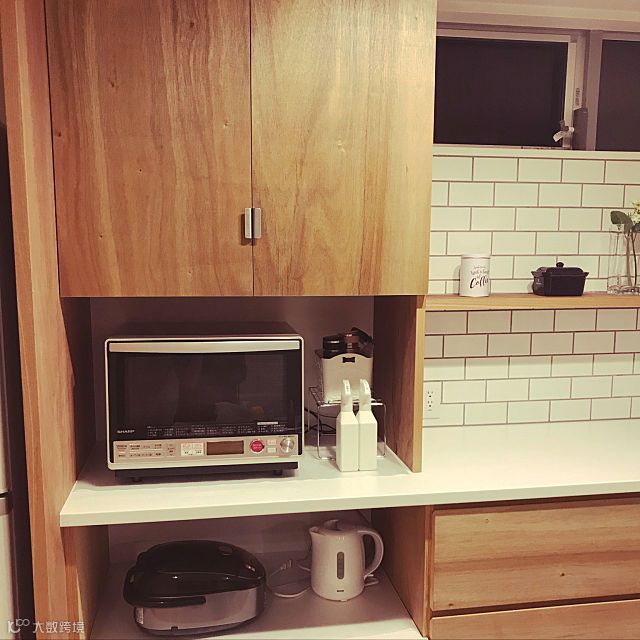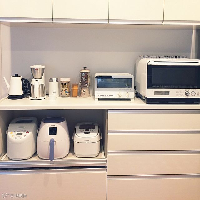 地柜留空在日本很常见。电饭煲、电磁炉、热水壶等这些比较小型的电器都可以放到这里。