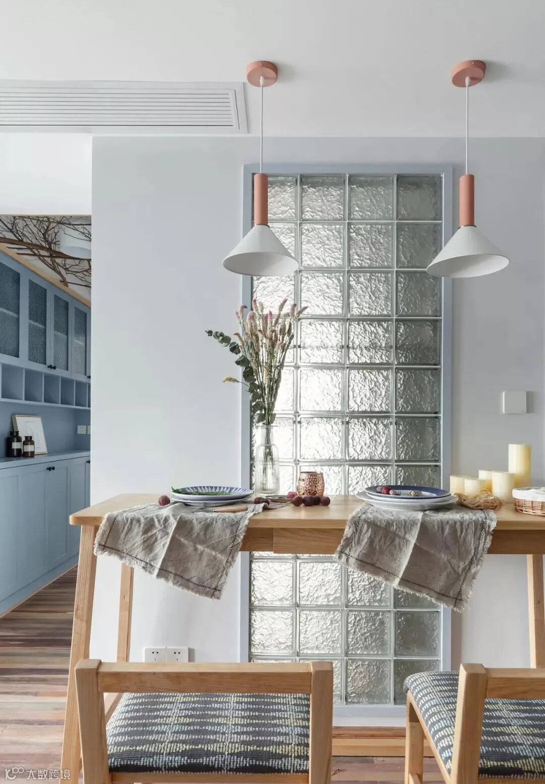 玻璃砖,可以简单理解为玻璃材质的砖头,在家居设计上,常被用做隔断,以增加室内采光和空间通透感。