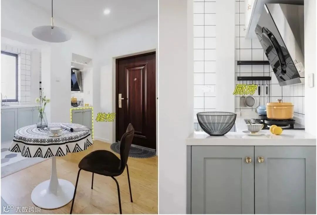 虽然这种情况不多,但下面这家就是个典型的例子,进门无玄关,右手边就是个开放式厨房,于是利用鞋柜和橱柜结合打造半开放式厨房,高度就根据橱柜高度即可,外侧作为鞋柜收纳业主的鞋子,而上面部分又可以作为橱柜的一部分,扩大厨房的操作台面。