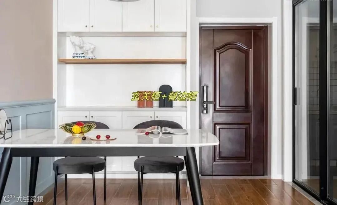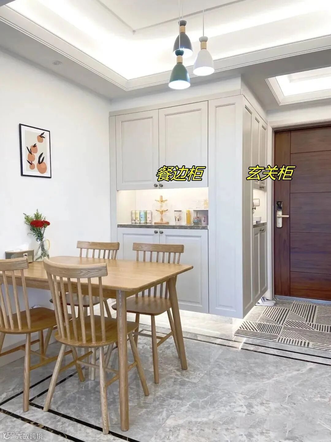 现在很多户型进门无玄关,入户就是餐厅,所以设计师大多选择用一个柜子满足两个空间的收纳功能,不仅能达到功能性二合一,而且还能节省空间,比起打两个柜子,这种整体感也会和更强。