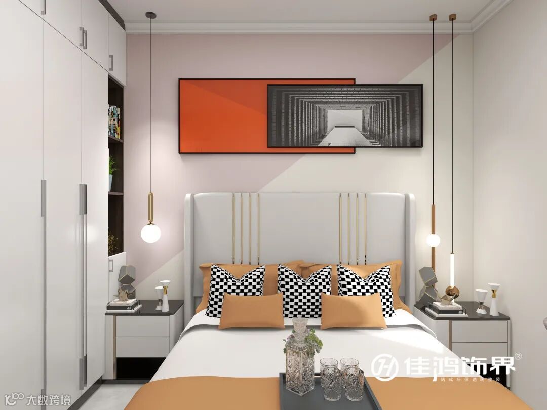 衣橱内置展示柜,起到摆放饰品的作用,还可放置书籍,结合两侧鱼线型金属吊灯,方便屋主夜读,对生活充满了仪式感。