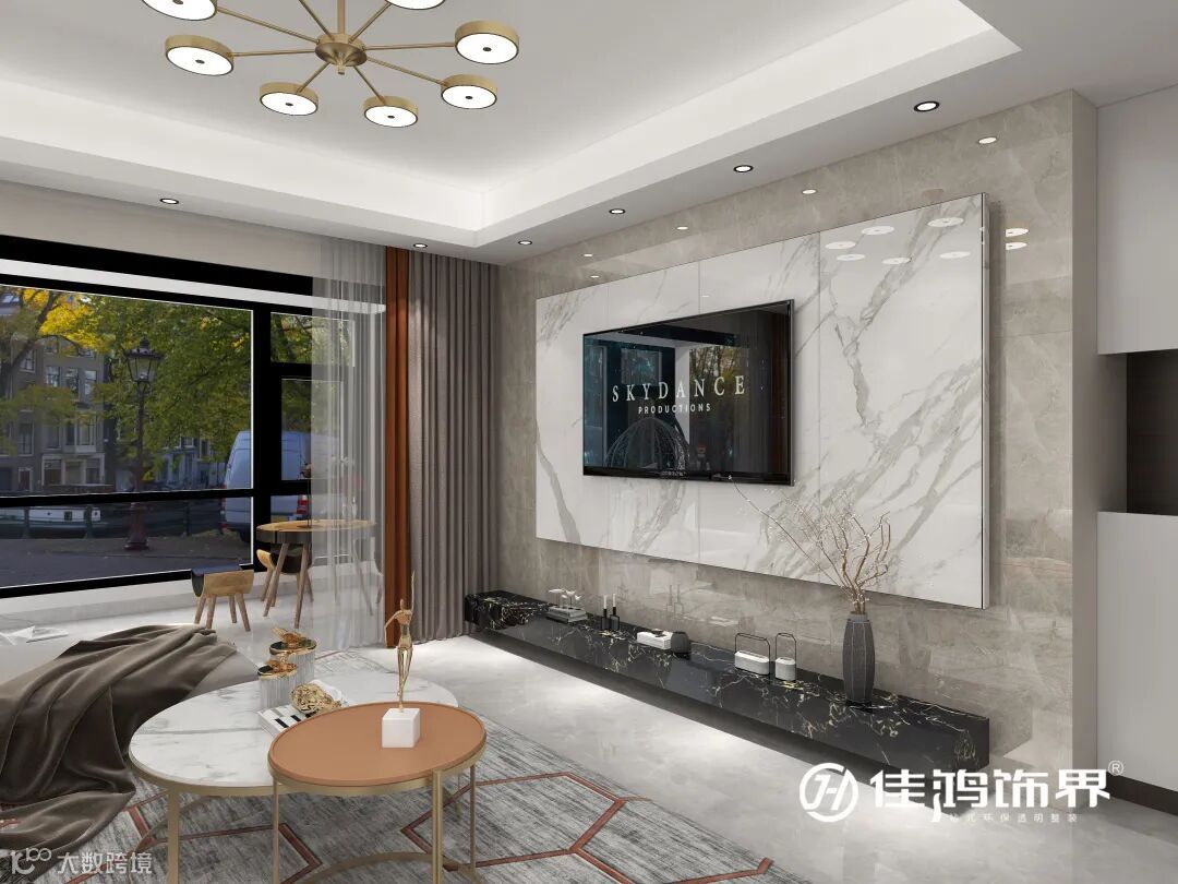 陶灰瓷砖、大理石岩板和黑金花地台相互映衬,成为更有层次感的电视背景,视觉上让人看起来舒适且放松,避免屋主因看电视产生的疲劳感。