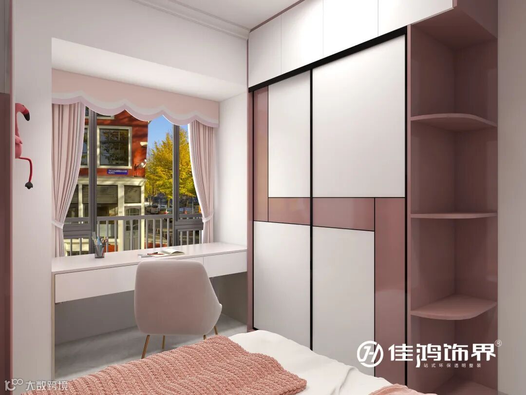 飘窗拆除后做书桌,绒面单椅柔软舒适,温煦的阳光透入,整个空间书香气息与甜美气息并存。