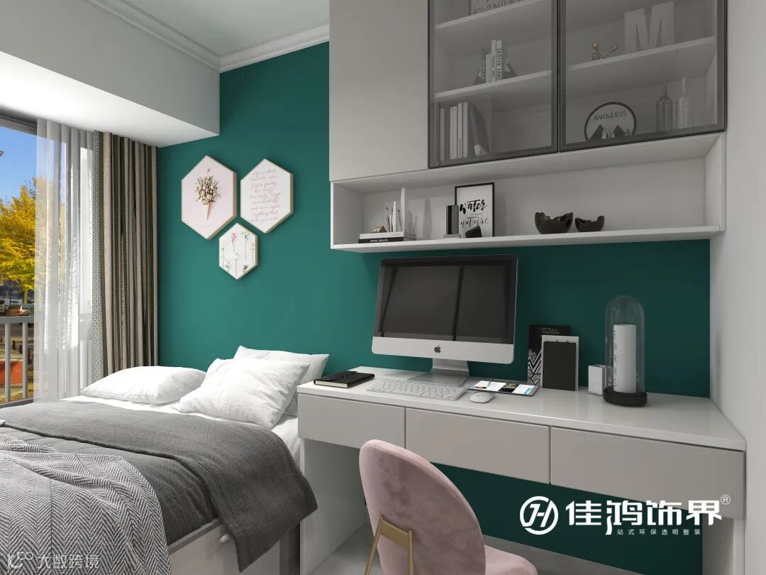 次卧床头背景墙用了孔雀绿,进入房间门有一个很好的视觉舒缓效果,也有助于促进睡眠。