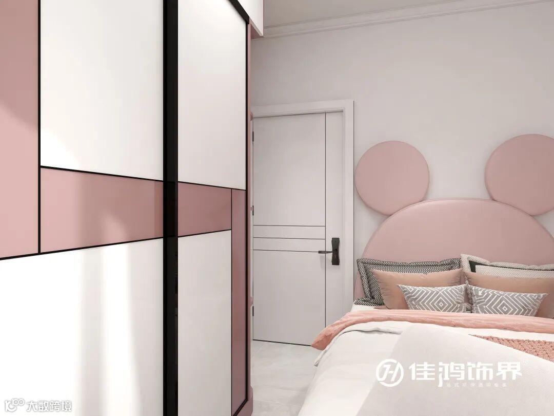 粉白配色,米奇床卧,女儿房温暖柔和,空间感简洁明了。