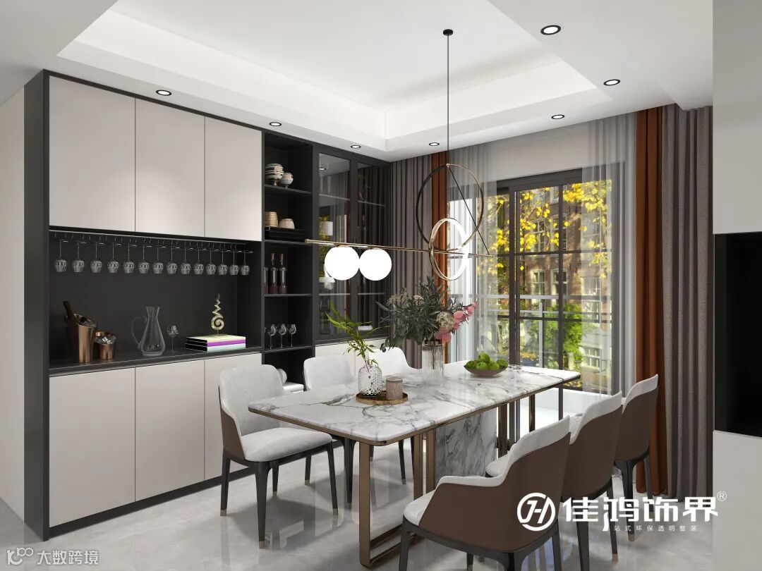 餐厅采用整面定制酒柜,黑白配色,经典而高级,极致统一。餐桌上,绿植点缀,衬托桌面天然的石材纹理,增加了一份自然清新的气息。