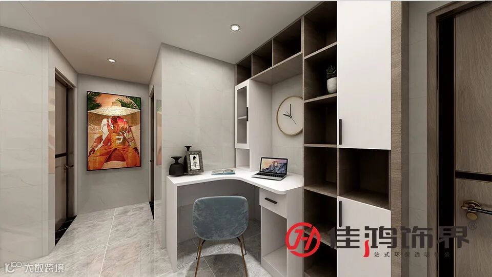 ▲拐角设置开放式书房,尽显设计巧思,空间得到了更有效合理的利用。同时在中间悬挂圆形时钟,象征着时间,珍惜学习提升的每一寸光阴。