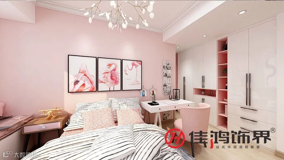 ▲粉色背景与火烈鸟挂画、浪漫吊灯的组合设计,十分甜美。衣橱柜和床头一侧的写字桌是女孩子必不可少的,沉稳、安静,呈现出更为宽敞细致的空间氛围。