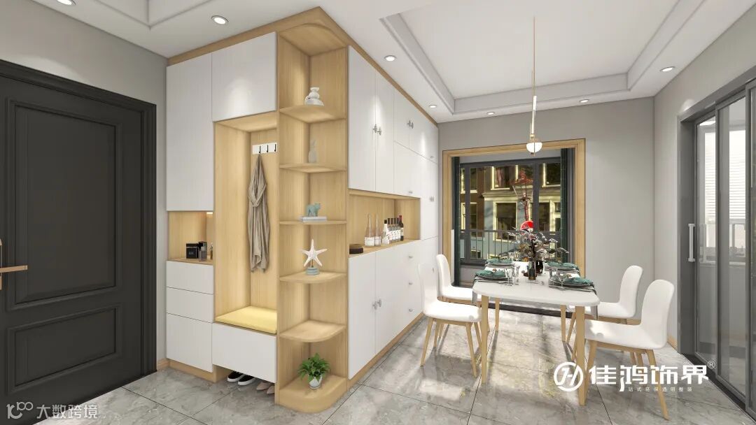 入户柜采用原木设计,无论从视觉还是功能上都更加干净整洁。开放格的设计很好的满足了一家人临时挂衣,放包包、钥匙的置物需求。