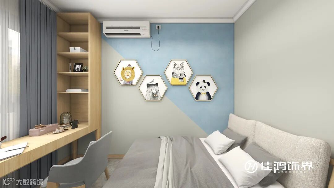 拼接色漆的背景,让整个儿童房的色彩和谐统一,学习和休息的空间也是舒适温馨,临窗而设的书桌,软包布艺的床头,动物挂画和小模型的装饰让空间看起来俏皮可爱。