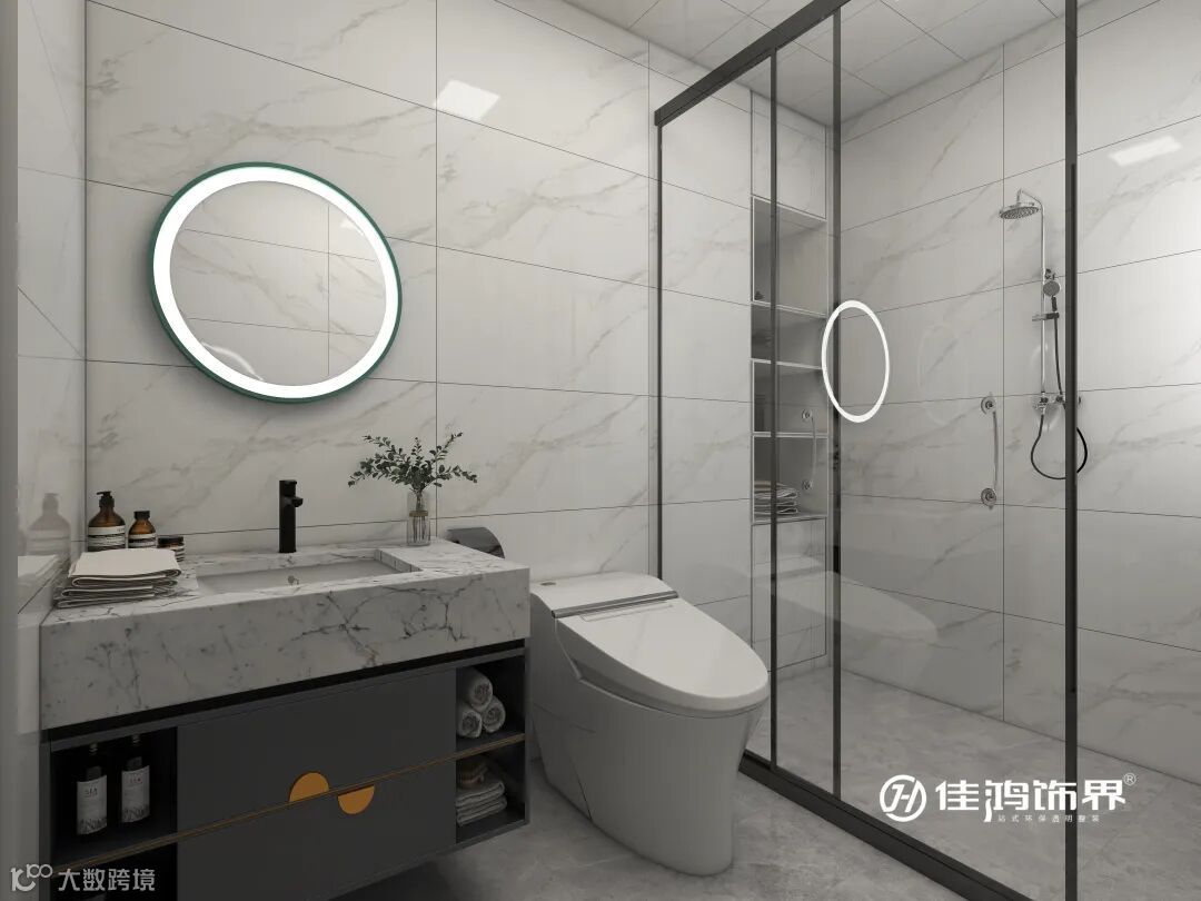 卫生间的墙壁采用了灰纹的大理石墙砖,摆放一瓶小绿植,营造出自然恬静的气息,圆镜和方形洗手池的搭配体现出了几何构成的美感。