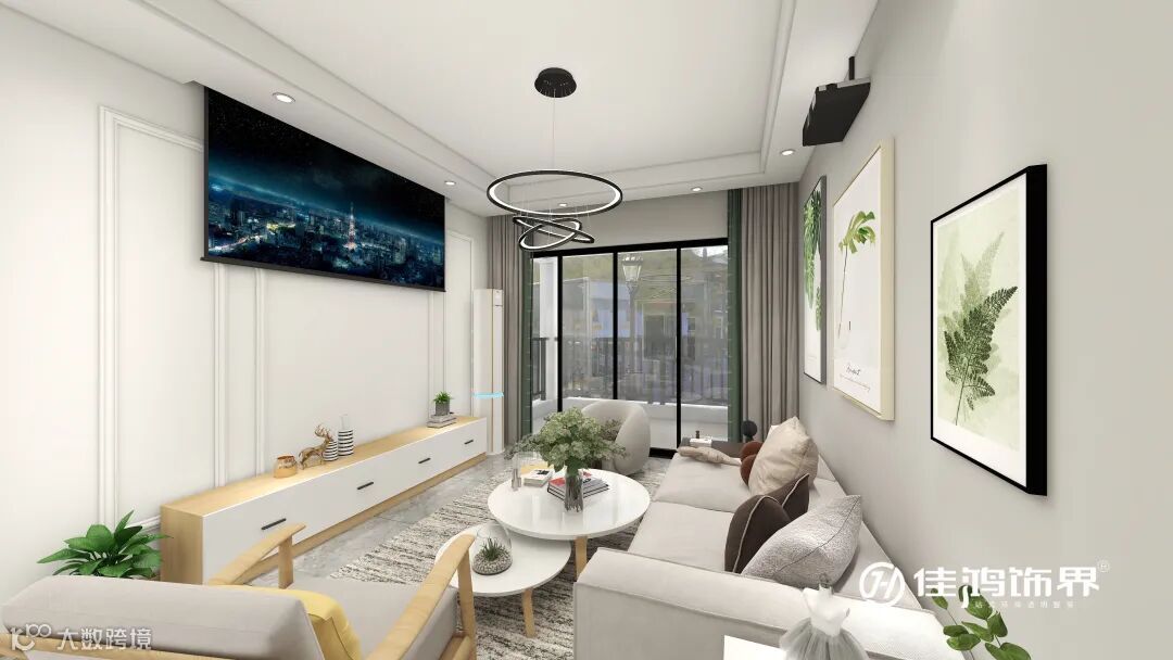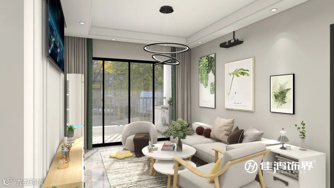 空间以灰白色+木色为主,局部用清新绿色点缀,电视背景墙以简约的石膏线装饰突出层次,投影仪的布置代替了电视,一家人躺沙发上观影,十分舒适惬意。