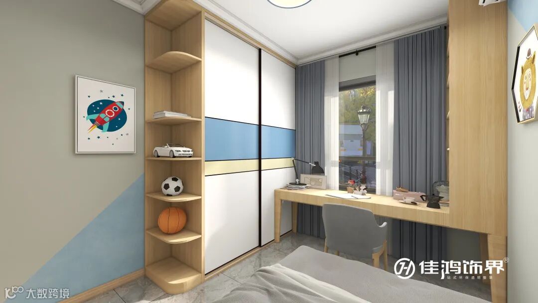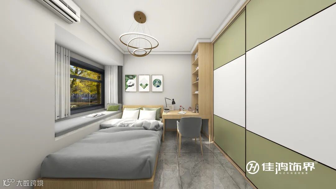 次卧的搭配以森系原木风为主。灰色的背景墙和木质的书桌架,搭配上牛油果绿的衣柜,打造清新自然的舒适环境。