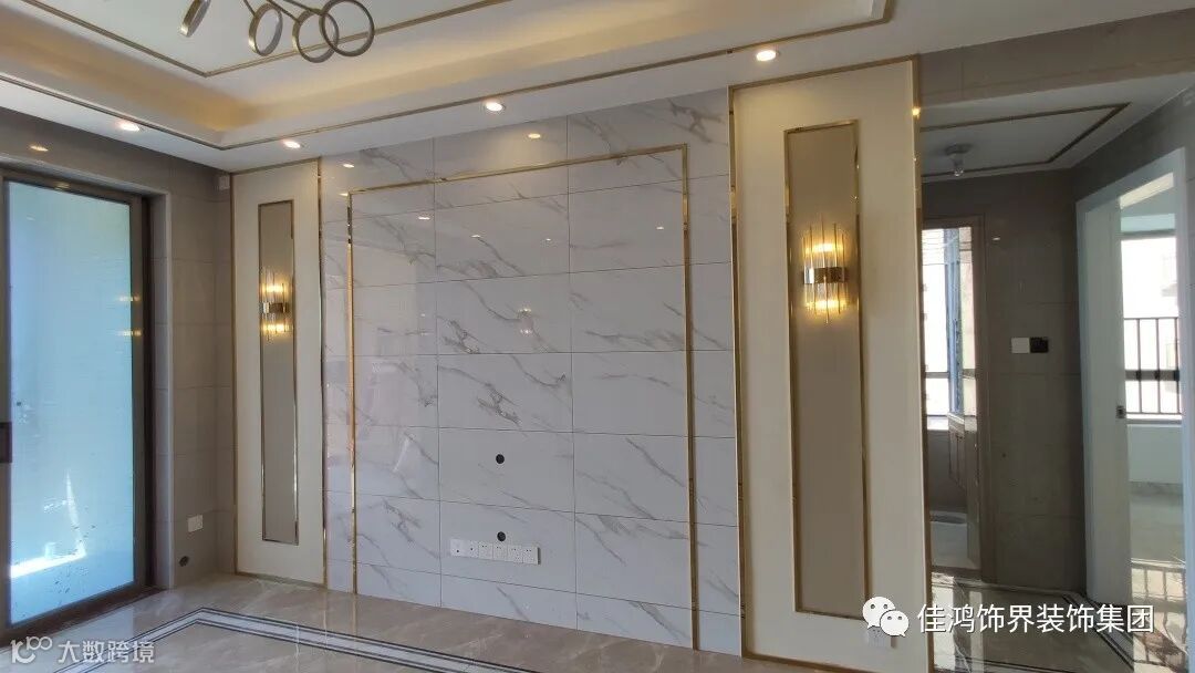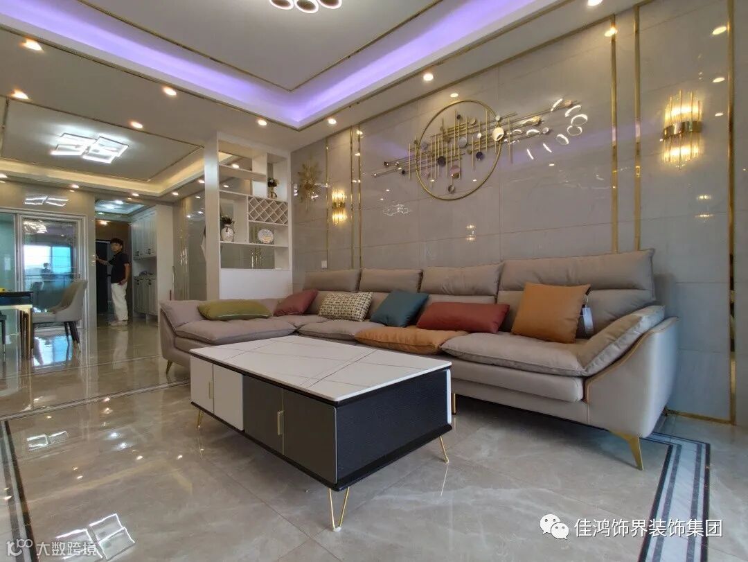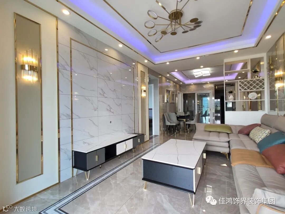 The natural marble TV background wall, with metal lines and wall lamps, is full of natural light and luxurious atmosphere, but also has a symmetrical aesthetic beauty. Corresponding to the artistic round and line decorations above the sofa. The leather soft sofa is bright and lively with macaron pillows. At the same time, a simple patterned cabinet table is placed to meet the needs of storage and is beautiful and generous. The overall living room has a wide view, combined with the rendering of lighting, to create an atmospheric and elegant atmosphere.