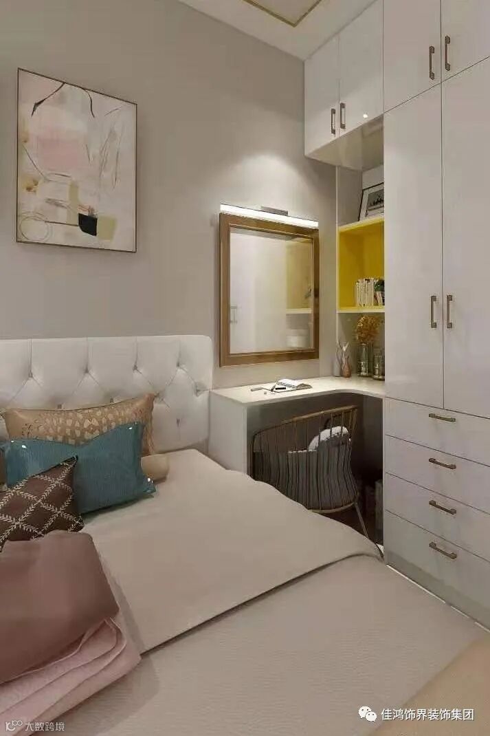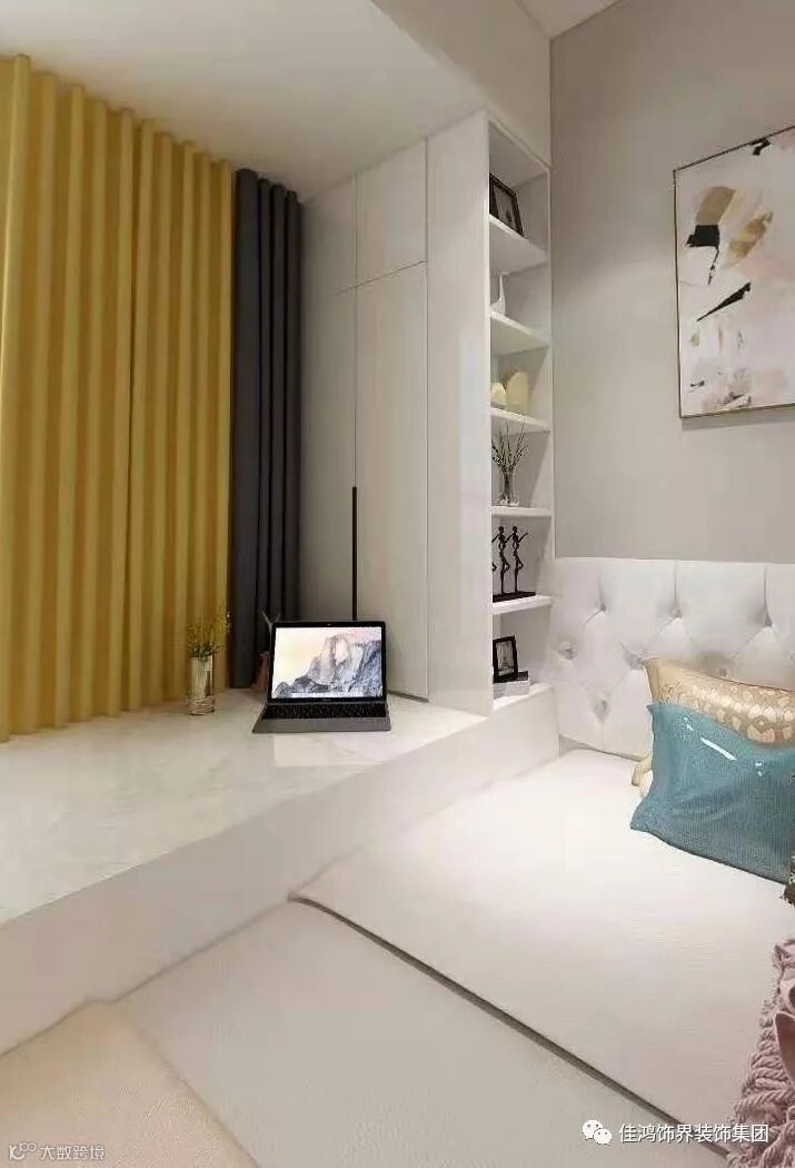 The bedroom is based on white, the soft-covered headboard, combined with elegant champagne, lake blue and brown pillows, arranges a rich layering sense, and the pure cotton bedding brings a silky and soft sleeping experience. Lie down on the bed, the left side is an integrated wardrobe table, with lively bright yellow embellishment, so that reading and learning is not dull and monotonous, and the right side is a bay window and a multi-cell display cabinet. The smooth panel blends with the bed. One, it looks comfortable and cozy.
