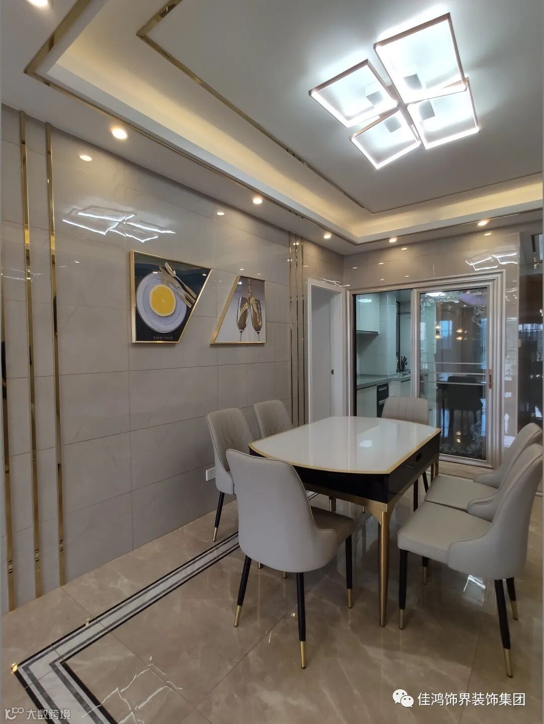 餐厅|现代简约的方形餐桌,皮艺与金属的大胆碰撞,质感而舒适,同时为空间增添白色的透明吸顶灯、贴合餐厅氛围的餐食装饰画,摒弃了过多的修饰与约束,保留必要的家具 ,通过时尚的造型,在美感与功能之间保持平衡,简而不凡,轻奢有度。
