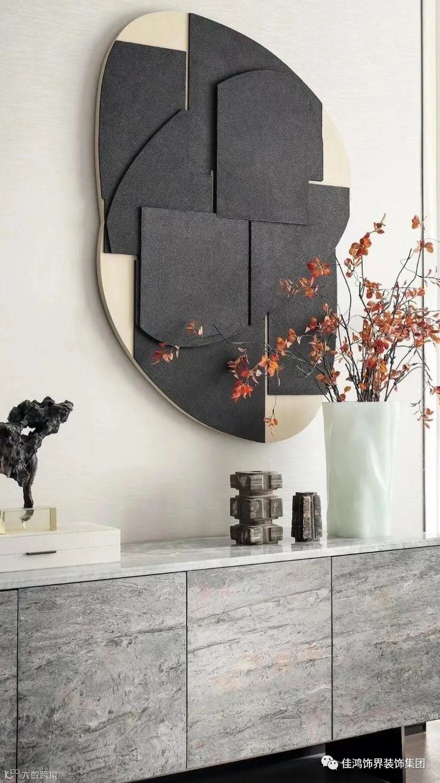 客厅|天然的大理石电视背景墙,加以金属线条和壁灯,充满自然轻奢气息的同时,又拥有着对称的美学上的美感,与之对应的沙发上方艺术感十足的圆形加线条的装饰物。皮质软沙发搭配马卡龙色系抱枕,明媚而活泼,同时放置简单花纹橱桌,满足储物的需求又美观大方。客厅整体以开阔的视野,结合灯光的渲染,营造大气优雅的氛围。