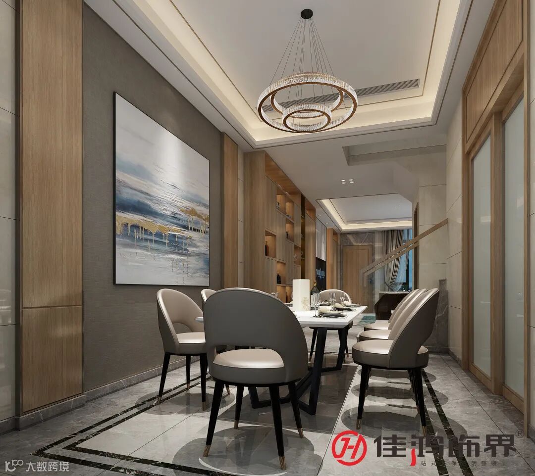 ▲餐厅与客厅互通在一条直线上,整体设计没有过于抢眼的造型,亦没有丰富色彩的叠加,而是以最典型的现代风格,令所有的色调统一;同时,配合层叠圆环吊灯的璀璨灯光,细节处流露出精致的生活情调。