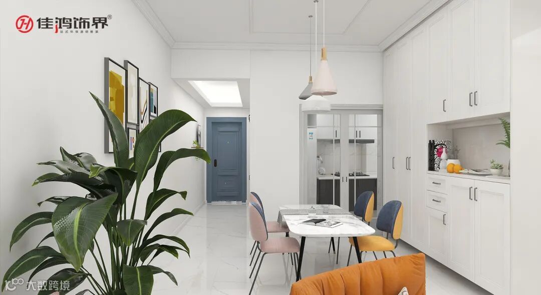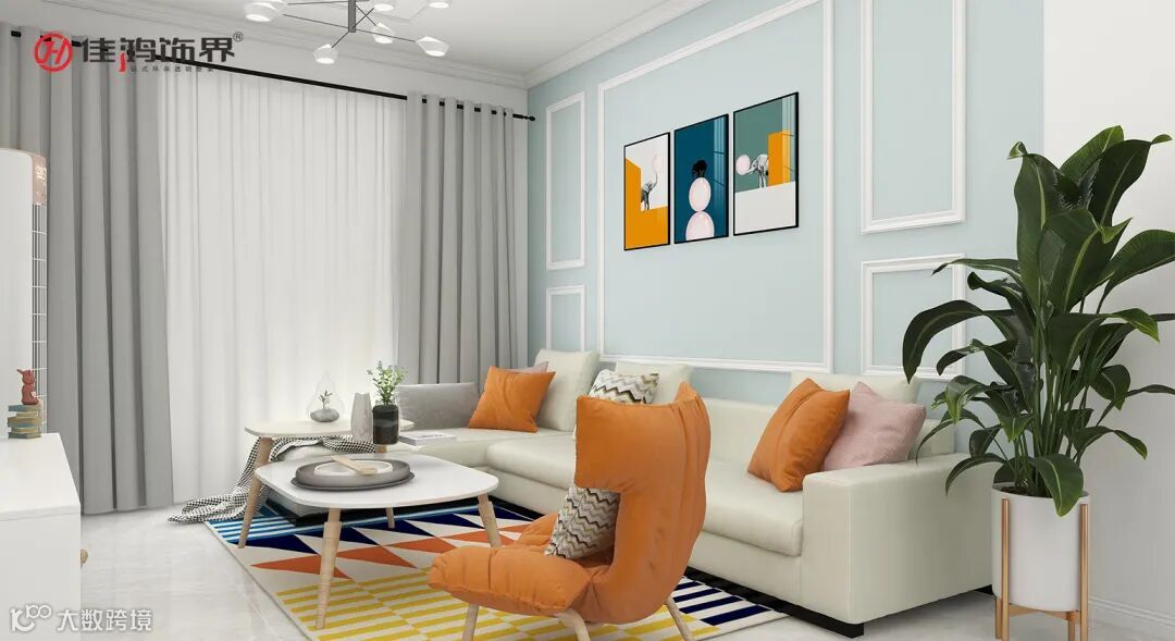 The calm gray, fresh and elegant blue, vibrant green, and bright and vivid orange are perfectly blended in the spacious living room. At the same time, plaster lines are used to decorate the sofa background wall, linear molecular lights decorate the space, beautiful and generous, and bring agile atmosphere to the space. The simple Nordic hanging paintings and geometric carpets, matched with the L-shaped angel white leather sofa, create a warm and comfortable living room atmosphere.