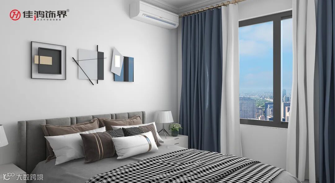 The soft-covered gray headboard and plaid fabric bring a modern and fashionable atmosphere. The pillows of different body sizes make it more convenient to use, with a variety of choices, without too many complicated decorations, adding artistic hanging pictures and blue and white curtains. The space is calm, warm and atmospheric.