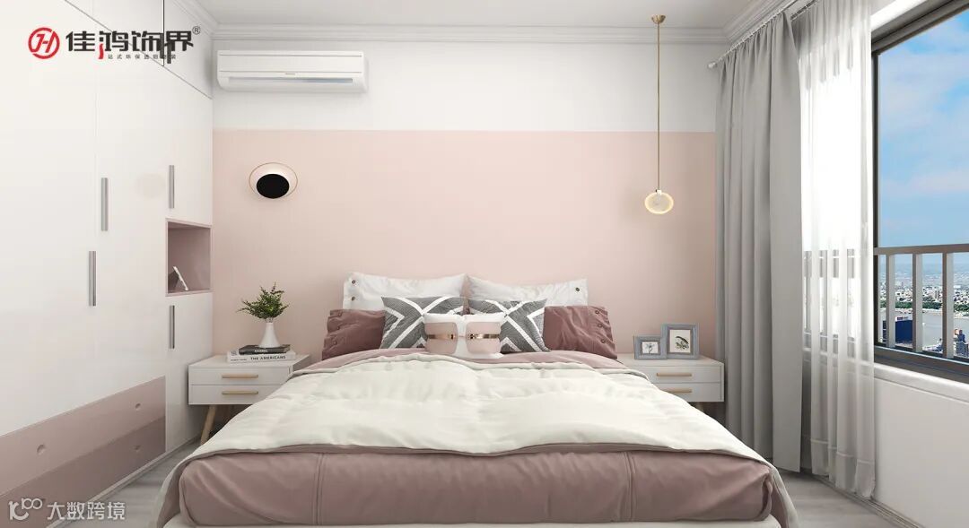 主卧|粉白相间,结合排列的靠枕,空间叠合出层次感,纯棉的床品柔软舒适,带来舒心的睡眠体验。简单对称的床头柜,造型感十足的壁灯和鱼线型吊灯,让静态的空间流动了起来,踩在原木质朴地砖上,纯色的飘帘将室外自然之景揽入,拥有极佳采光效果的同时,视野也开阔明朗。