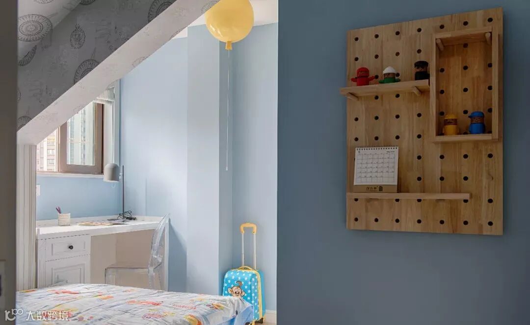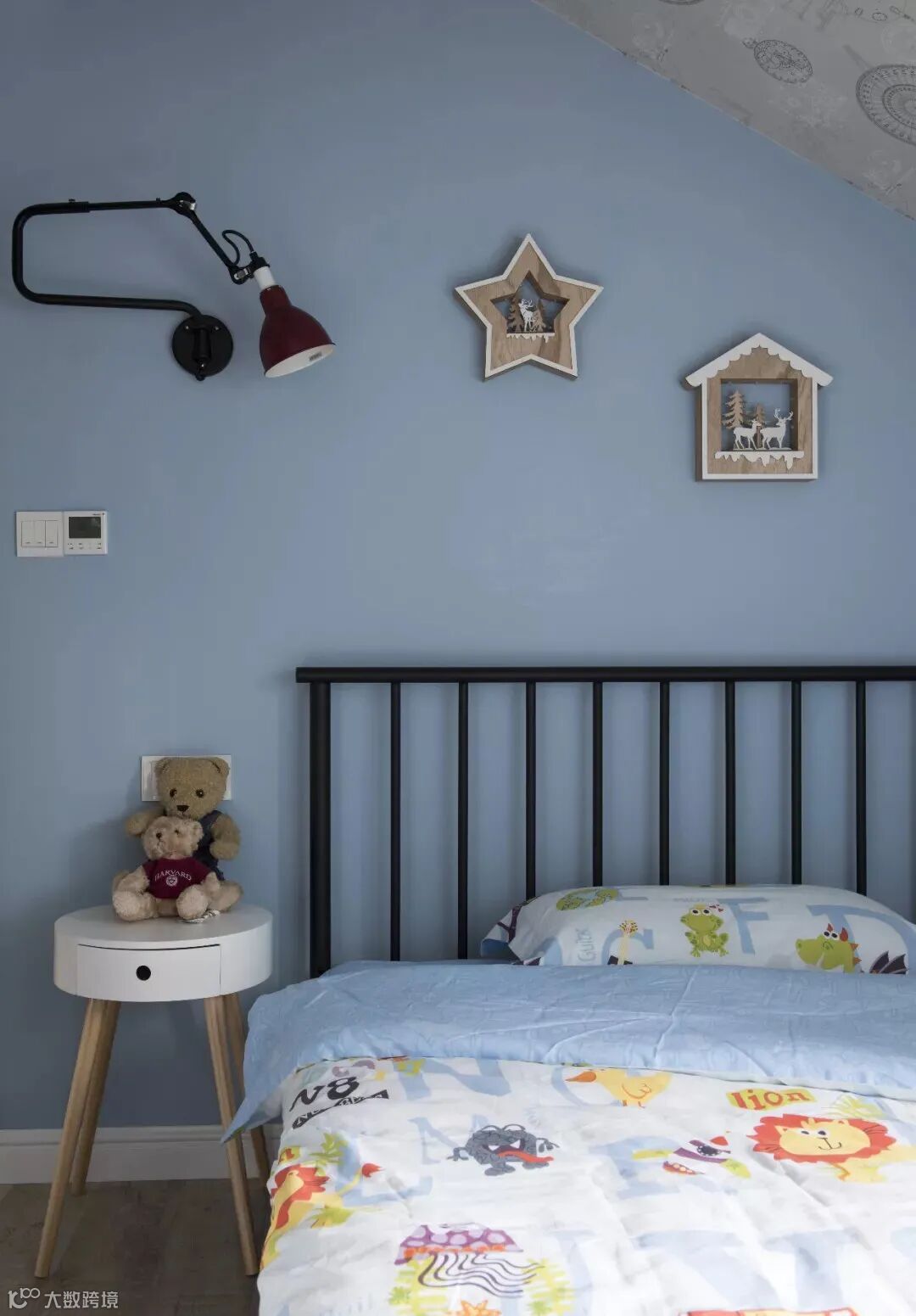 ▲ 墙面乳胶漆选用蓝色,像天空一样让孩子的梦自由徜徉。精巧的相框和台灯是童心的真实写照。