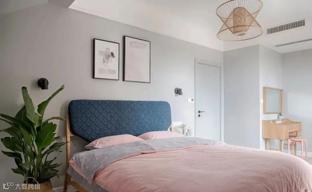 ▲ 主卧墙面采用整体浅灰色,干净纯粹,适合睡眠,伴着忙碌一天的主人从容入眠,别致的竹艺吊灯,又给房间增添一份情趣。