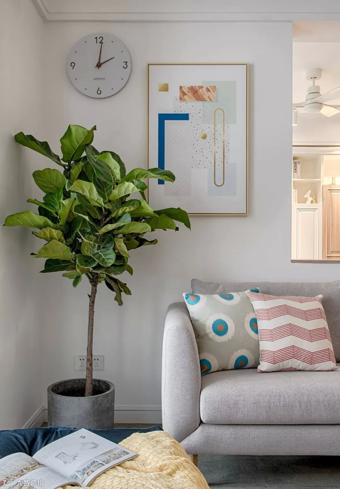 ▲ 布艺沙发和浅色木制家具的搭配,尽显家的温馨舒适感。抱枕与搭毯及装饰画这些软装的点缀,增添了些许活泼的气息。