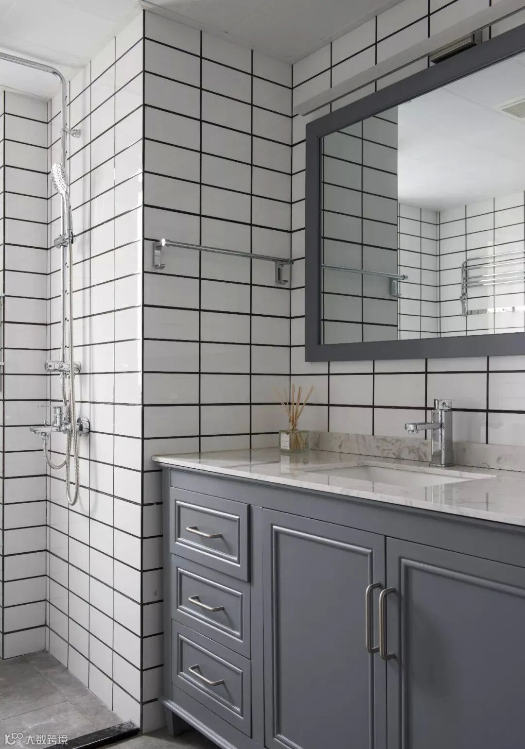 ▲ 卫生间选用白灰配色,简单的配色和较大的镜面,冲淡了原本的狭仄局促。