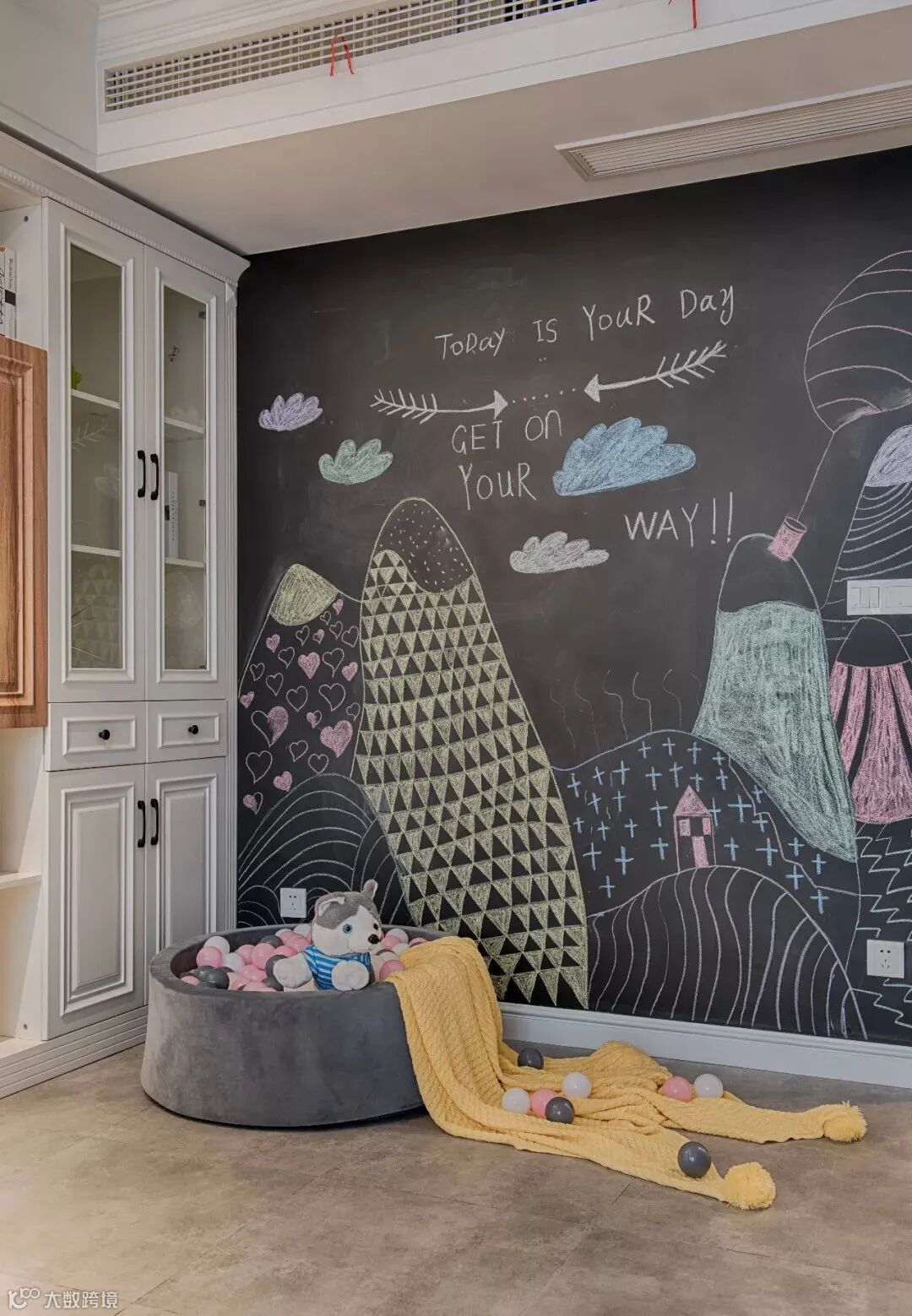 ▲ 书房布置成一个多功能一个区域,既可以是父母工作、阅读的场所也可以被布置为宝宝的游乐场。黑板墙的设计,给了孩子一个自由发挥创意的地方。
