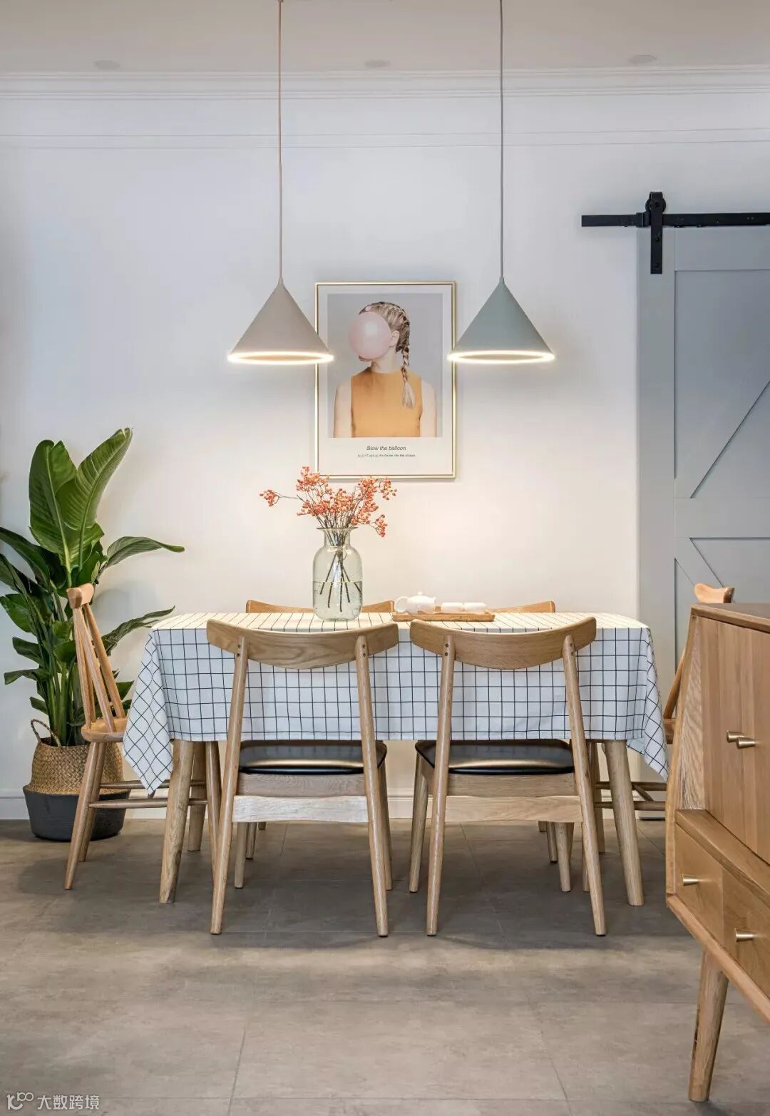 ▲ 餐厅用原木色餐桌和椅子,再搭配绿植、插花和装饰画;以及一旁的谷仓门,自然简约的装饰,营造出一个温馨而清新文艺的用餐空间。