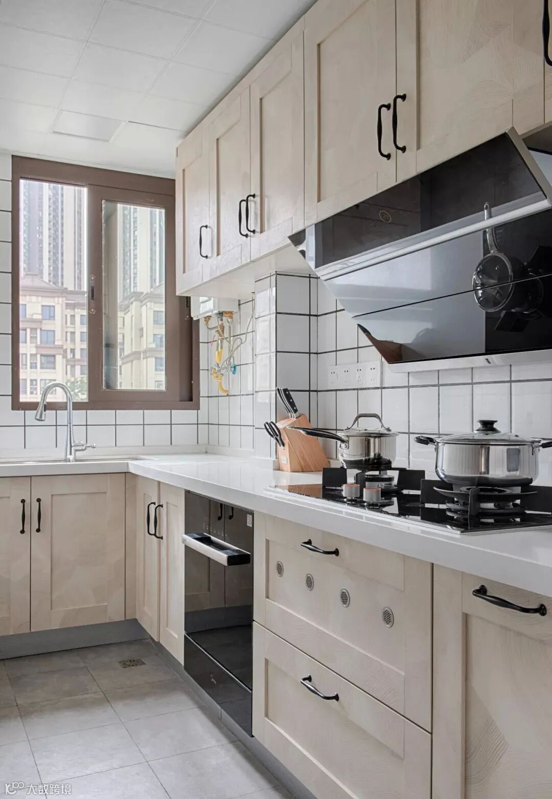 ▲ 厨房整体以大理石材质白色瓷砖贴墙,浅灰色系的瓷砖铺地,既容易清理也耐脏。在色调上延续了客厅和书房的搭配,自然和谐,看上去也很整洁美观。