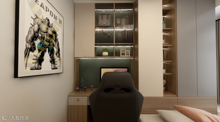儿童房|儿童房用玻璃书架,格橱的结合,浅白灰加墨绿的色调,为空间烙印了的独特标记,在原木材质的连接下,书桌与收纳装饰成就了空间的流线型与年龄特色,动漫挂画和手办让小朋友与喜爱世界更紧密的联系。