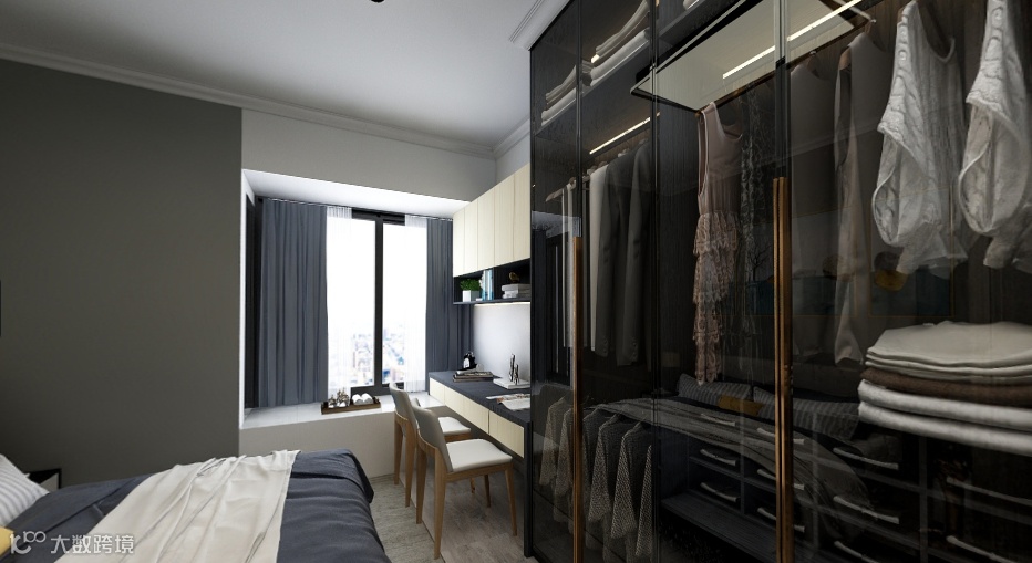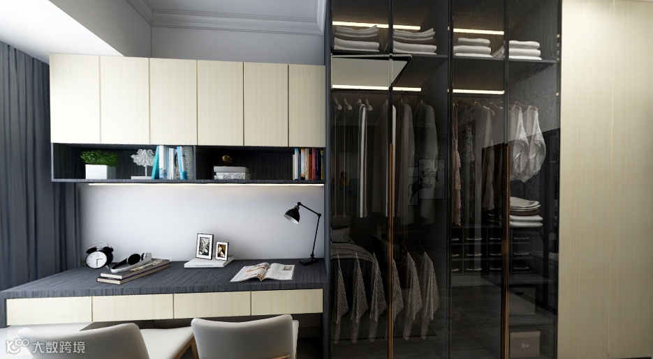 主卧|灰白蓝搭配的色调,创造最舒适的睡眠环境和视觉空间,豪华大床和双人式书桌,放松的同时也能一起享受学习充实带来的乐趣。容量需求不一定是巨大的,黑色玻璃金属拉手的衣橱隐约透出衣服的质感,衣物摆放整齐有序,突显主人认真生活的态度,对品质的追求。