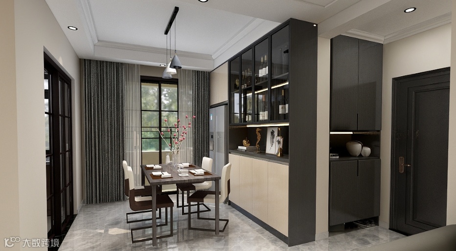 餐厅|艺术感十足的锥形吊灯下,含苞的花骨朵浪漫而慵懒。餐厅墙面米色涂料,地面烟灰色抛光砖,营造出一种使空间尽情挥洒源远流长的神韵,让餐厅细节部分散发出舒适与温馨感,在简单与平和之中方显亲和力。