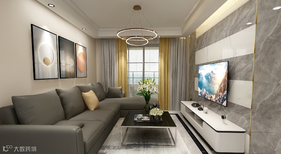 客厅|主灯的环形设计首先归置了整个空间的温顺,明亮的黄是点缀整个空间的色彩,用温暖而柔和的质感沙发挑动着你的感官,白灰相间的大理石背景墙带来独特简约的氛围,与几何挂画呼应着,突显了方与圆的美学搭配理念。