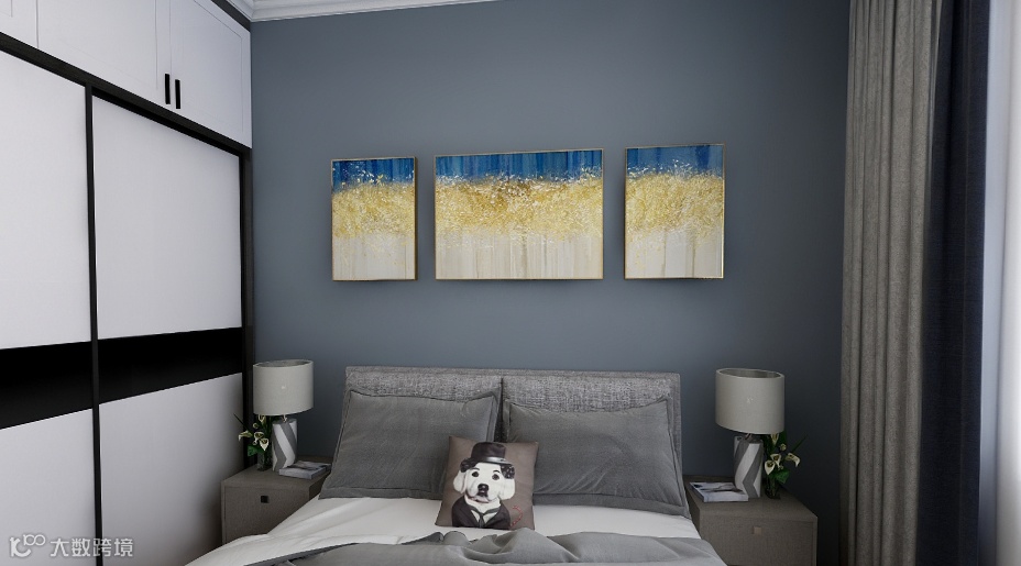 次卧|造型简约的床具与鲜明的色彩点缀,色彩对比突出层次感。灰色乳胶漆与层叠窗帘的搭配,似融非融,装饰整个空间。