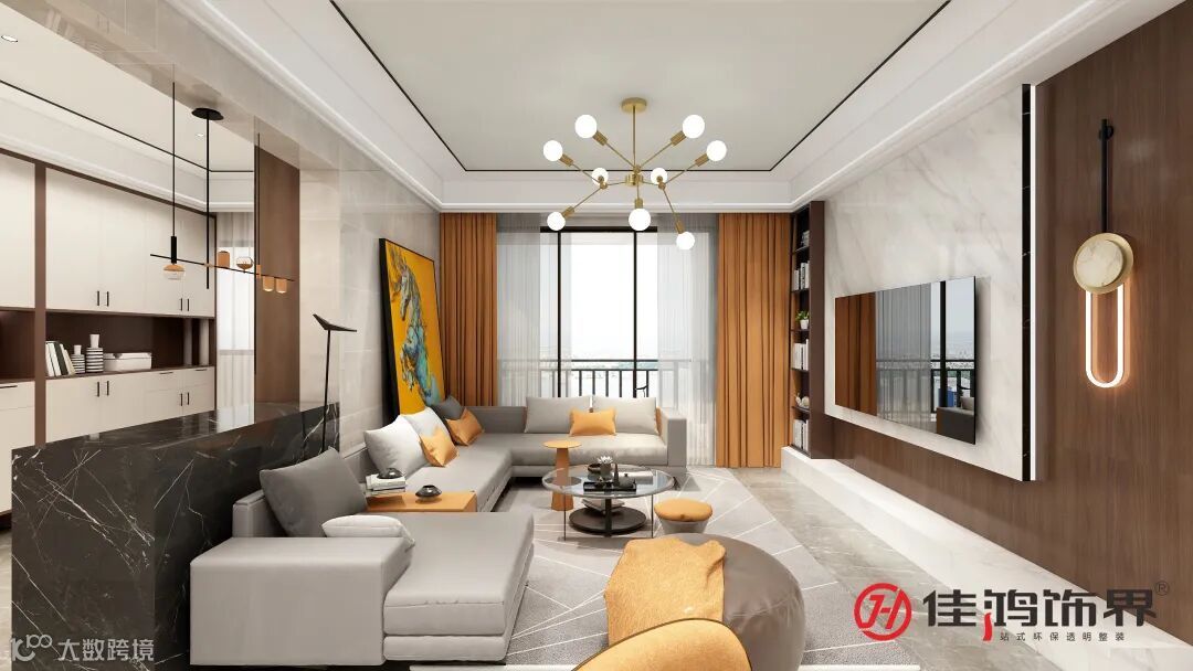 客厅|客厅的电视背景墙采用独特纹理的大理石,搭配木质的隔板,木质与石材的融合,突出了整个客厅空间的中心,丰富墙面的同时也更有立体感,大气而优雅;在软装搭配上选用橙黄色、灰色等高级配色,提高空间的品质,明亮不失精致;沙发后侧做岛台设计,区分出独立而互动性极佳的区域,空间十分通透。