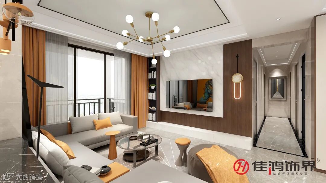 The TV background wall of the living room is made of marble with a unique texture, matched with wooden partitions, and the fusion of wood and stone highlights the center of the entire living room space. While enriching the walls, it also has a three-dimensional effect, which is atmospheric and elegant; Orange, gray and other advanced colors are used on the top to improve the quality of the space, which is bright and exquisite; the island is designed on the back of the sofa to distinguish independent and highly interactive areas, and the space is very transparent.