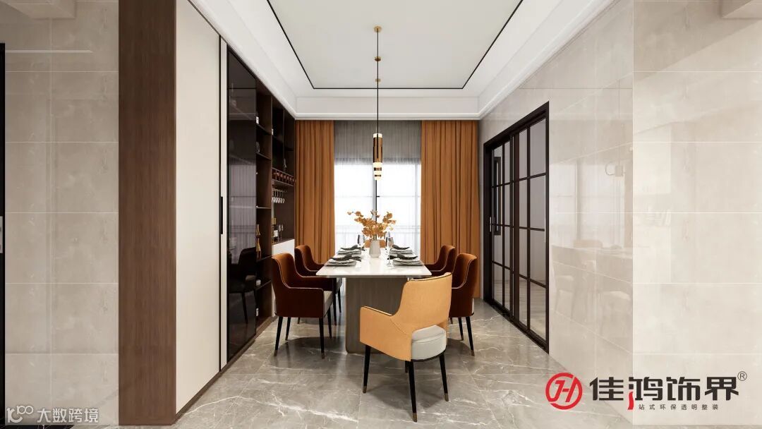 餐厅|餐厅延续客厅的活跃时尚的橙棕配色,以及多种材质的穿插运用,打造高端的空间格调;餐厅选用的金属吊灯,与餐桌上的插花相映成趣,于自然气息中融入现代的精致感;嵌入式餐边柜为餐厅增加收纳和物品展示的空间,灰色石材纹理的地面也为整个空间增添了质感。