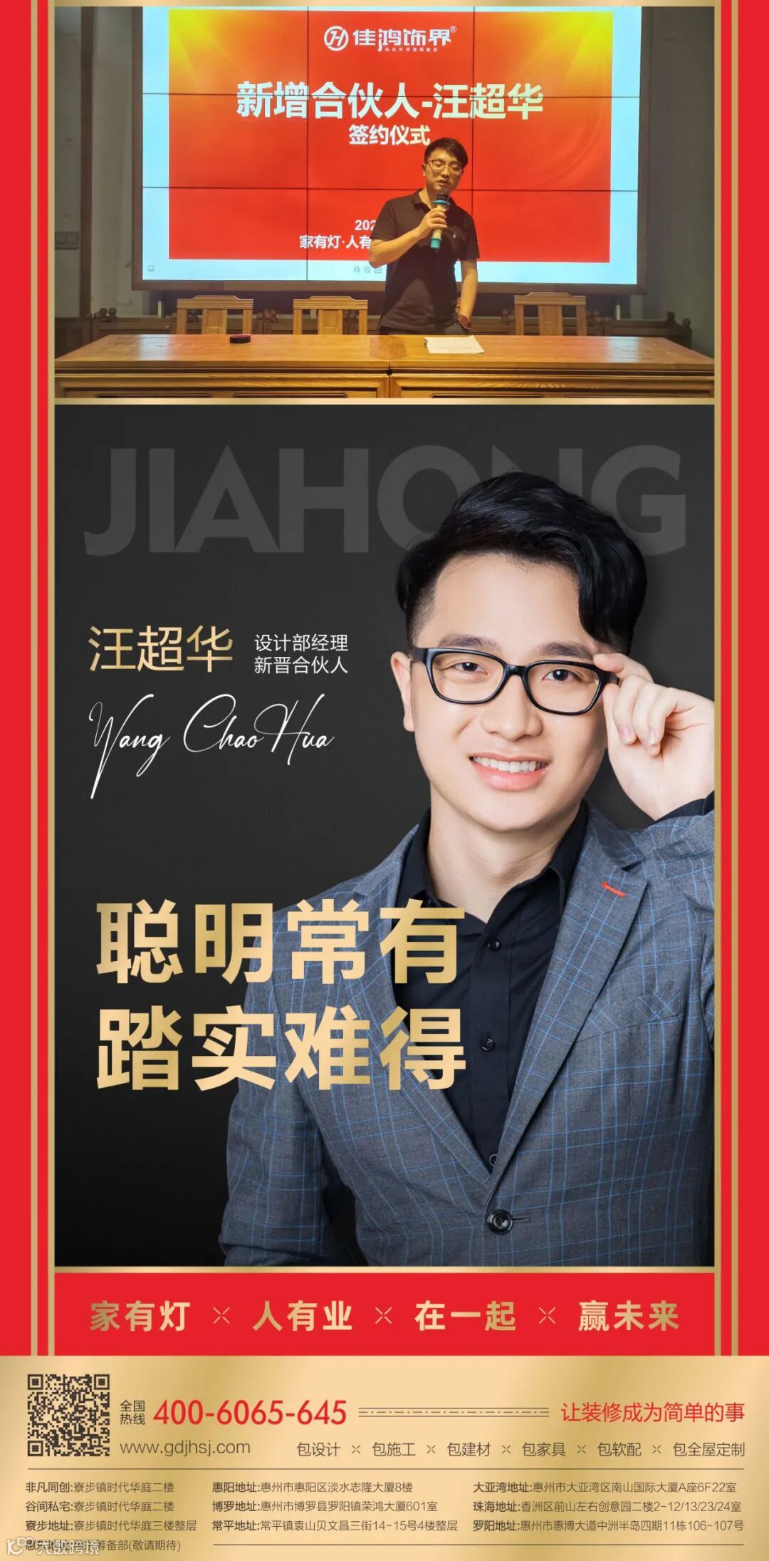 目前旗下注册商标品牌: 佳鸿饰界整装、谷间私宅、非凡同创3大品牌,同时有佳鸿V8.大宅,佳鸿VV软装两个事业部。在东莞寮步、东莞常平、珠海香洲、惠州大亚湾、惠州博罗、惠州惠阳、惠州罗阳等地设有分公司,是广东省最具竞争力装饰公司之一及全国头部家装500强企业。