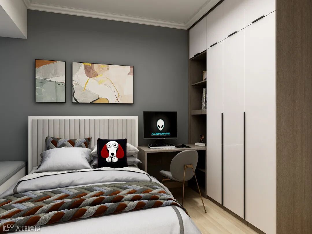 卧室|原木橱柜,色彩抽象画,绳纹床品交相辉映,小狗抱枕又为空间带来趣味性。紧密连接的木质书桌,为学习提升放松身心注入宁静沉稳的力量。
