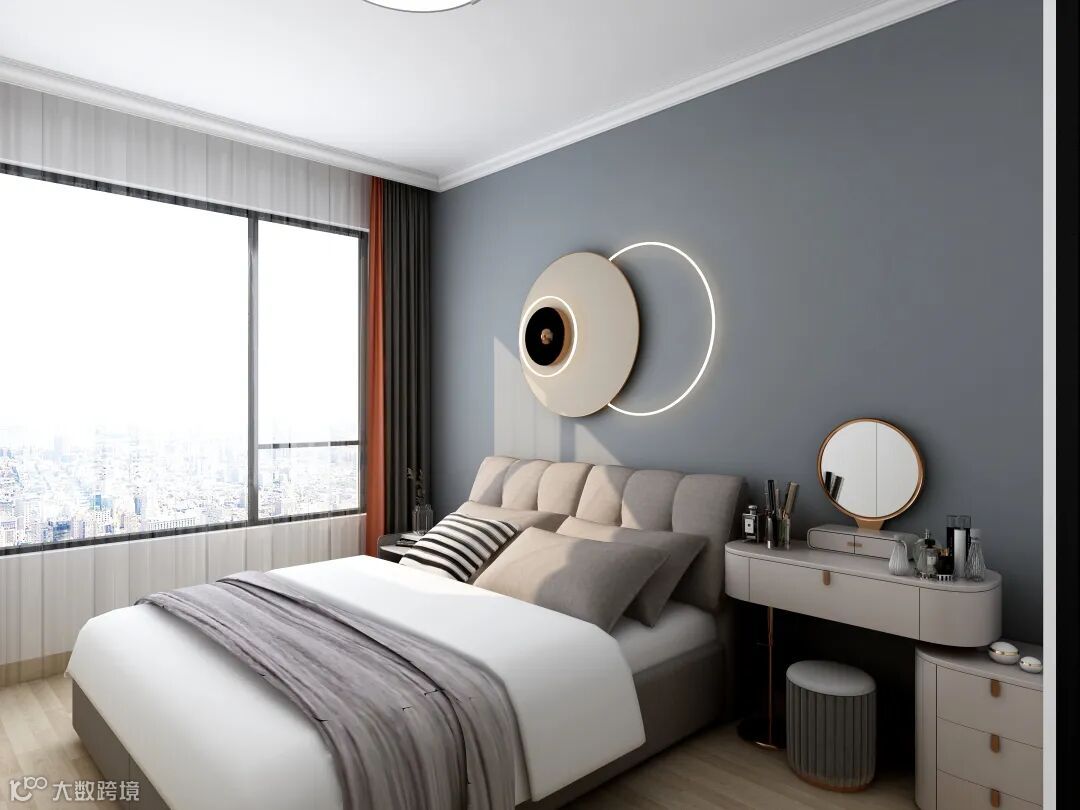Creamy gray wall paint, wooden floor, and soft-covered headboard create a simple and comfortable sleeping environment. The eye-shaped ring light provides a good soft lighting effect while being decorated with personality. The weather is just right in the afternoon, and the sun is also mild.