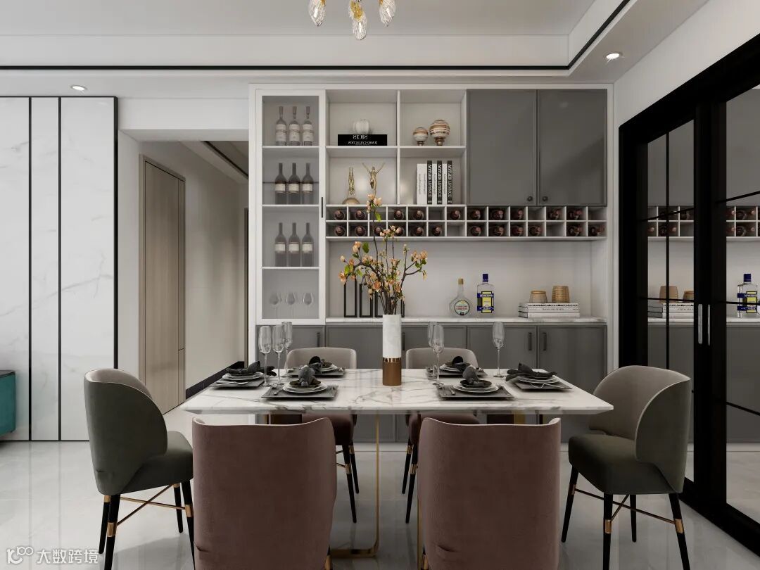 餐厅|整面橱柜的酒,透露出主人的喜好。闲暇之余,轻举酒杯,精致的餐食,在青粉交错的绒面单椅中享受生活带来的浪漫。