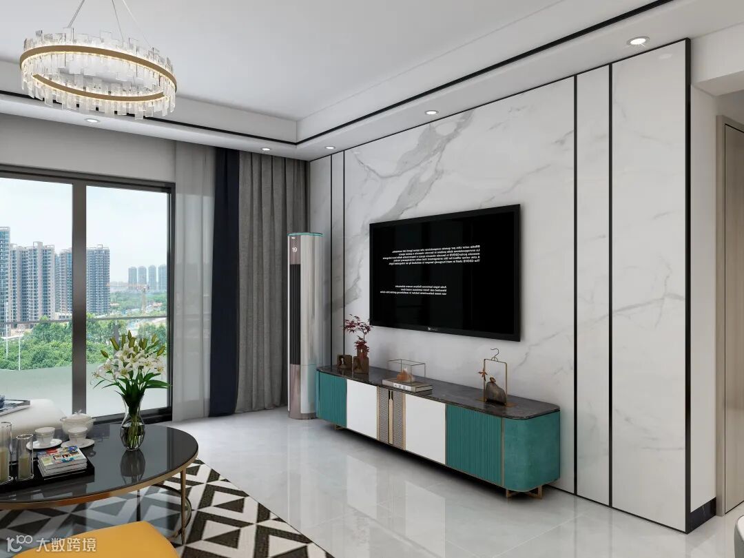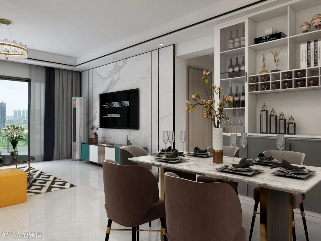 The white and clean brick surface, gorgeous crystal chandeliers, rhombus carpets, and cyan collision paint cabinets embellish it, which is fashionable and full of texture. The fence-style cabinet is easy to replace and place items, simple and beautiful.